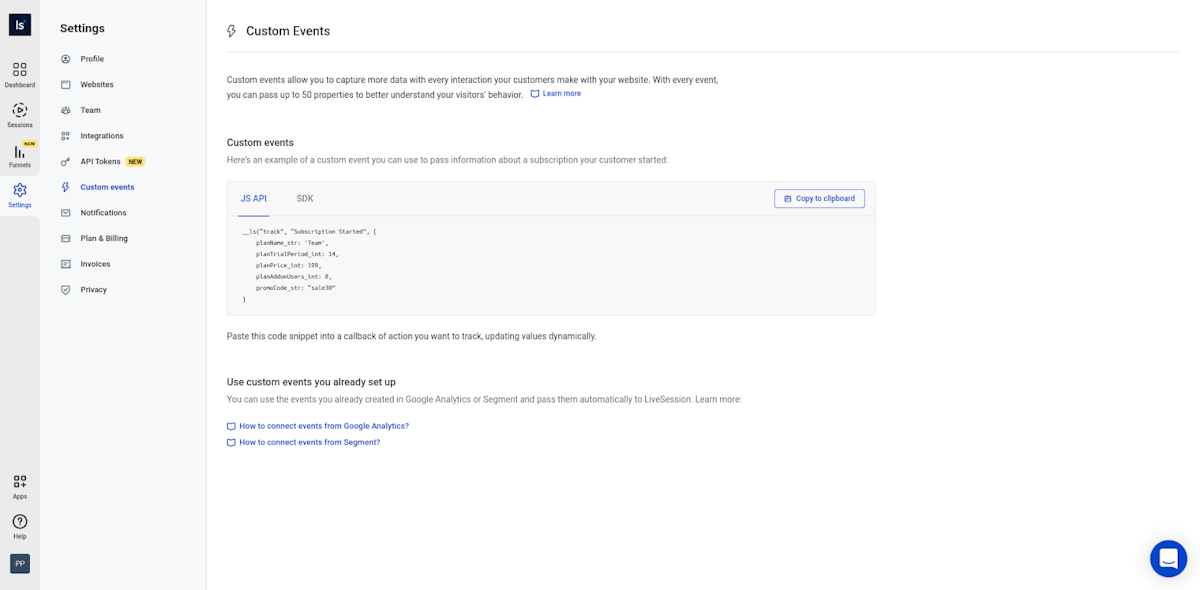 We’ve added a custom events settings page. From now on, you can get examples on how to set up Custom Events or how to use your Google Analytics or Segment events with LiveSession