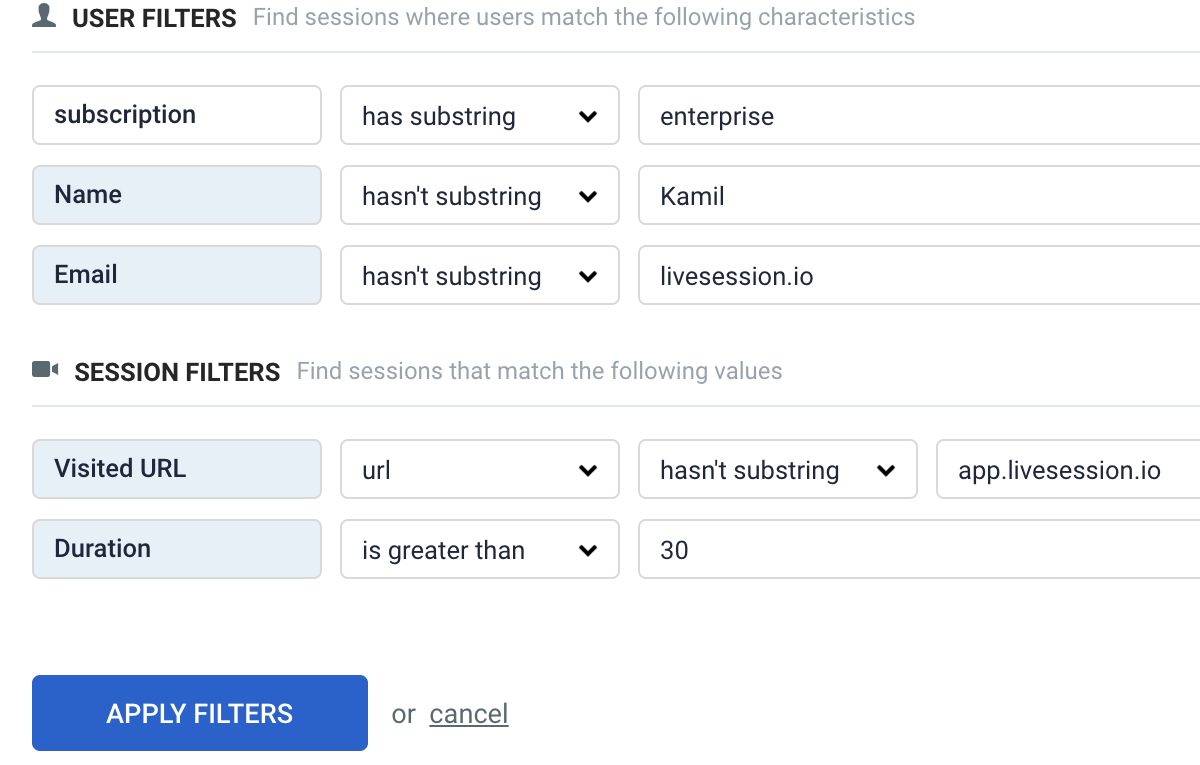 New filter operator is now available. For Name, Email, URLs and Custom params you can filter sessions using a substring value.