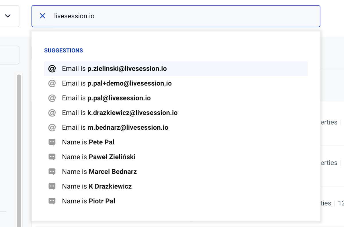 As of today, you can use LiveSession’s search bar to find users by their email addresses or name. This action will create a new search with an adequate filter: