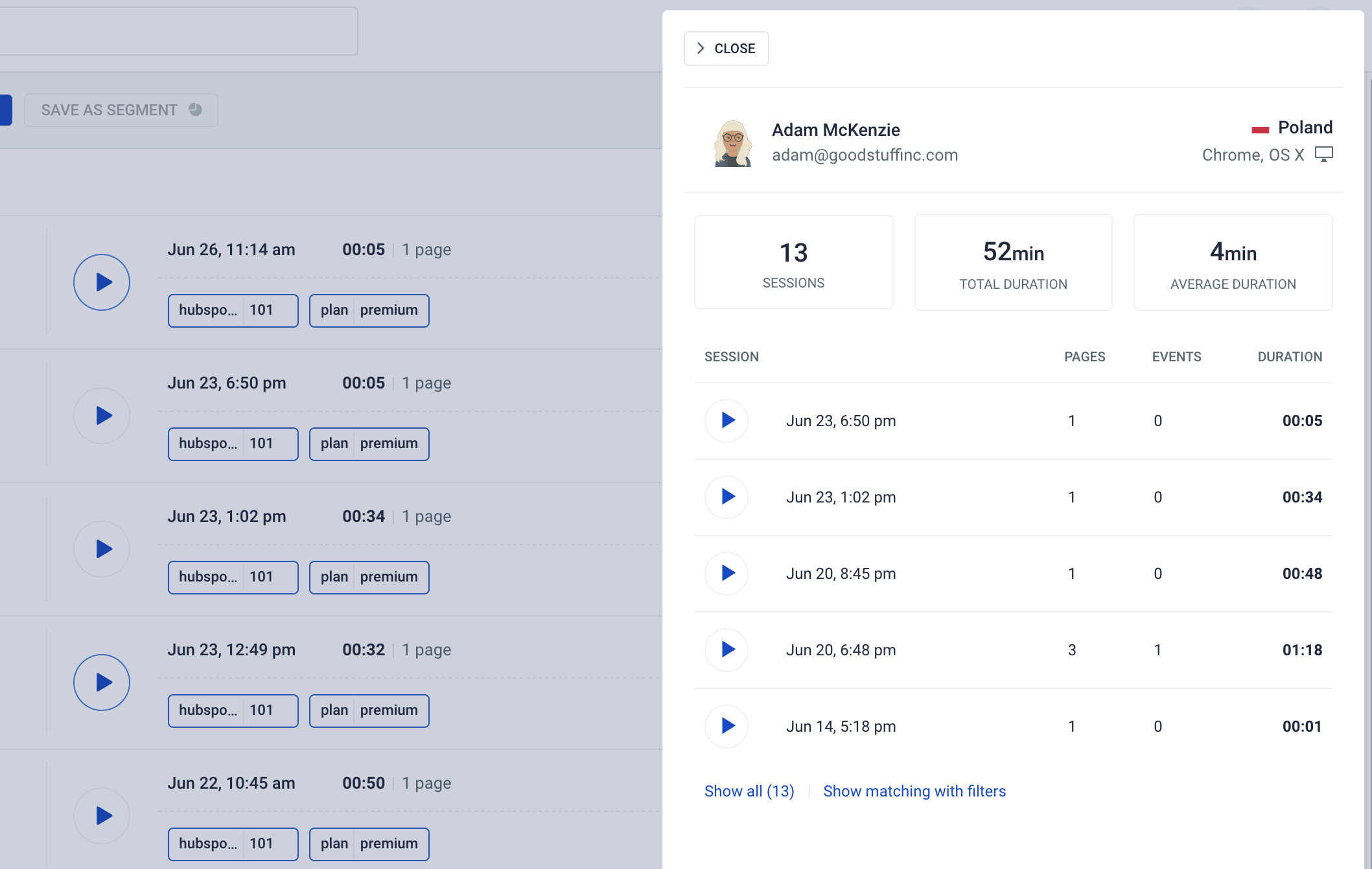 From now on, you can get more information about the user by clicking on the name or ID on the sessions list. It is an easier way to find other user's sessions or to get aggregated information about the number of sessions and duration.
